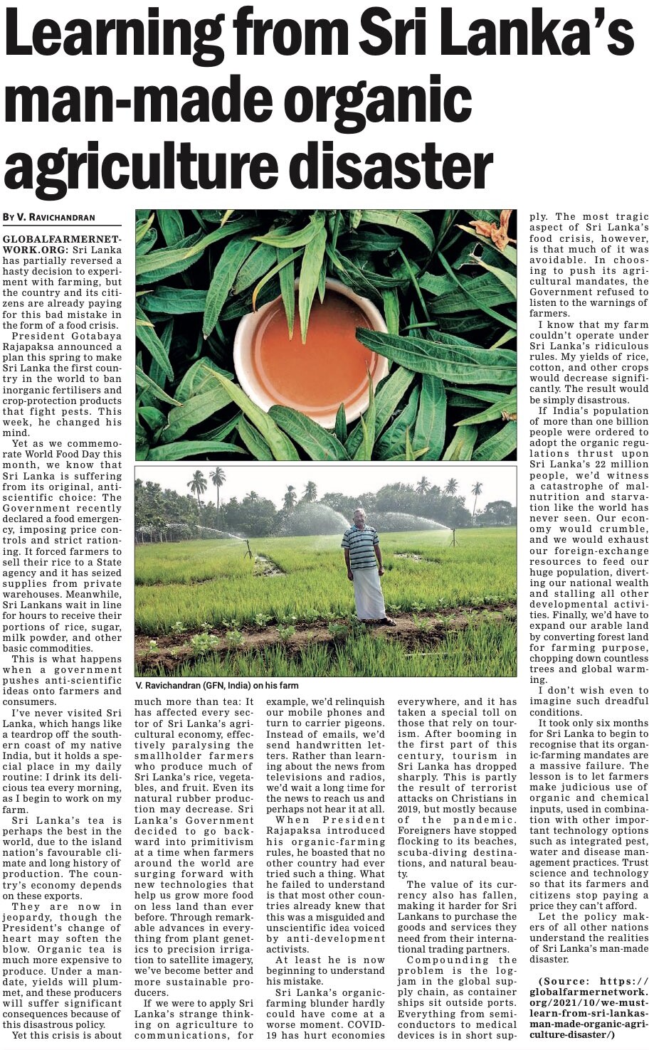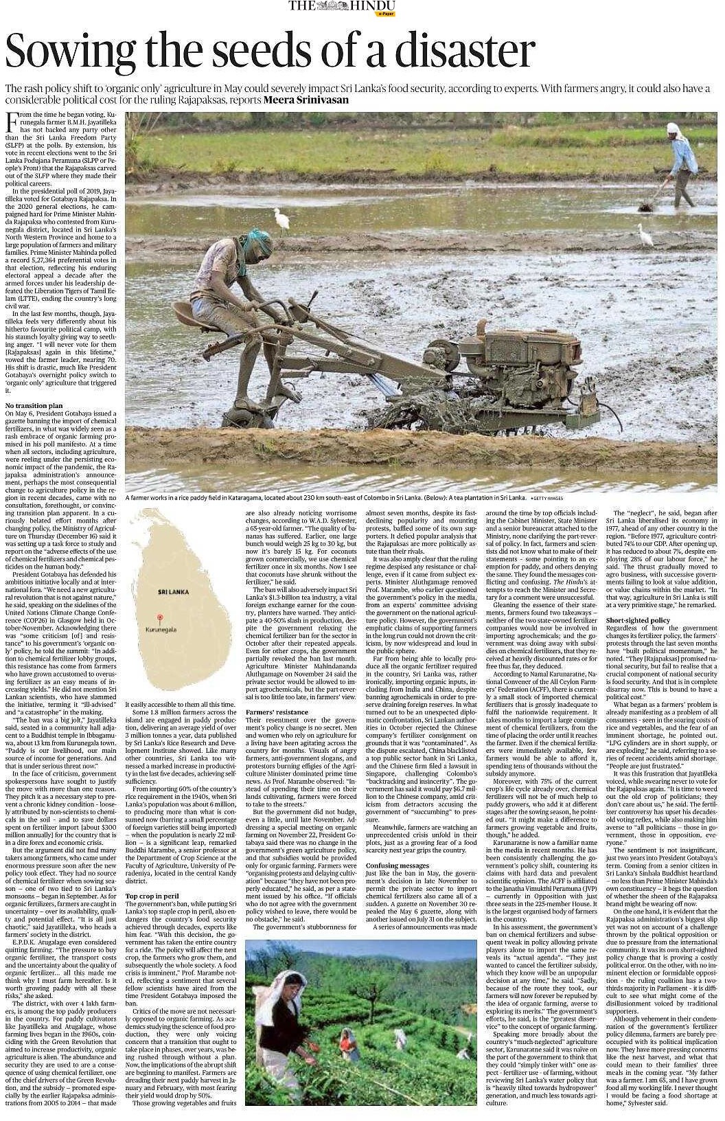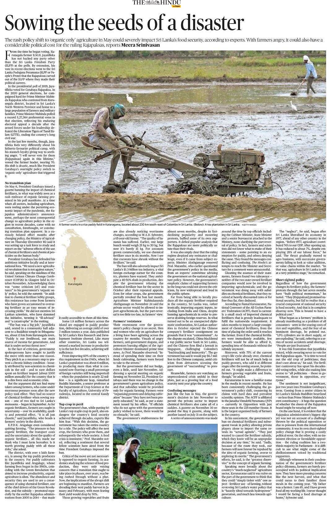 <q>Politica <q class="s">doar organică</q> a Sri Lankei | Semănând semințele unui dezastru</q> publicat în The Hindu înaintea dezastrului